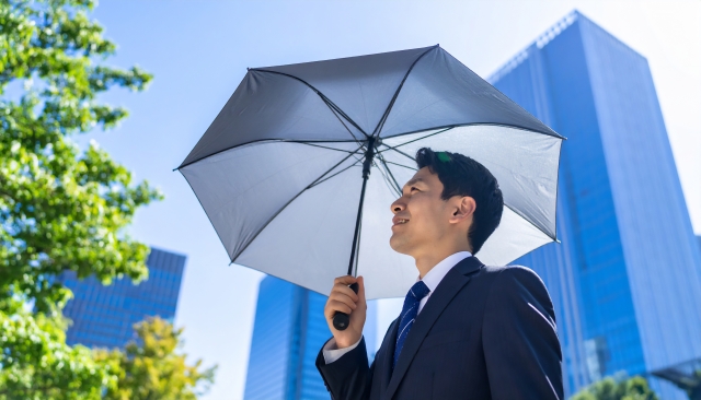 最近ではスーツスタイルにも合うシンプルなデザインの日傘が増えており、営業や外回りの多いビジネスパーソンにとって実用的なアイテムとなっています。